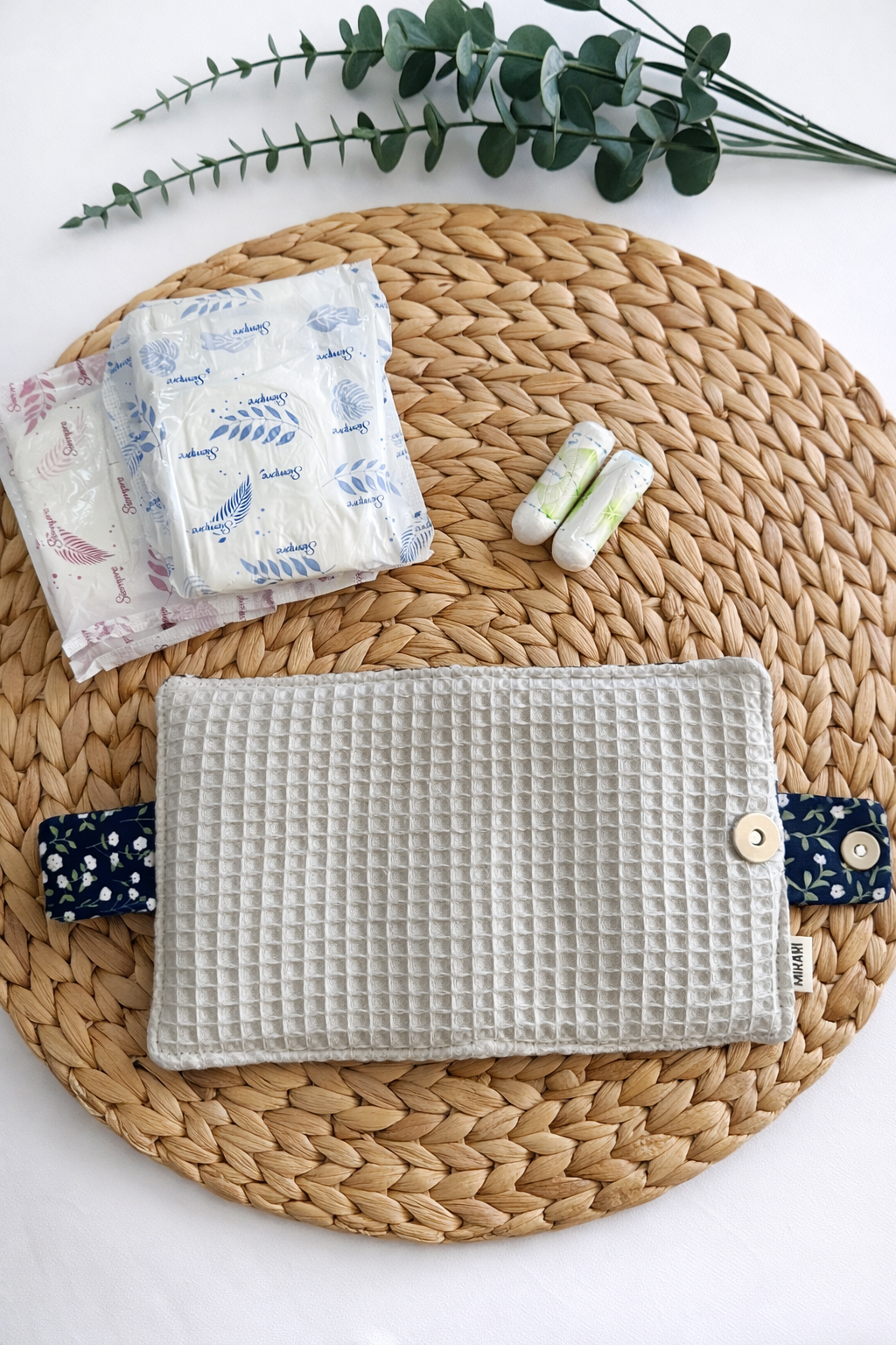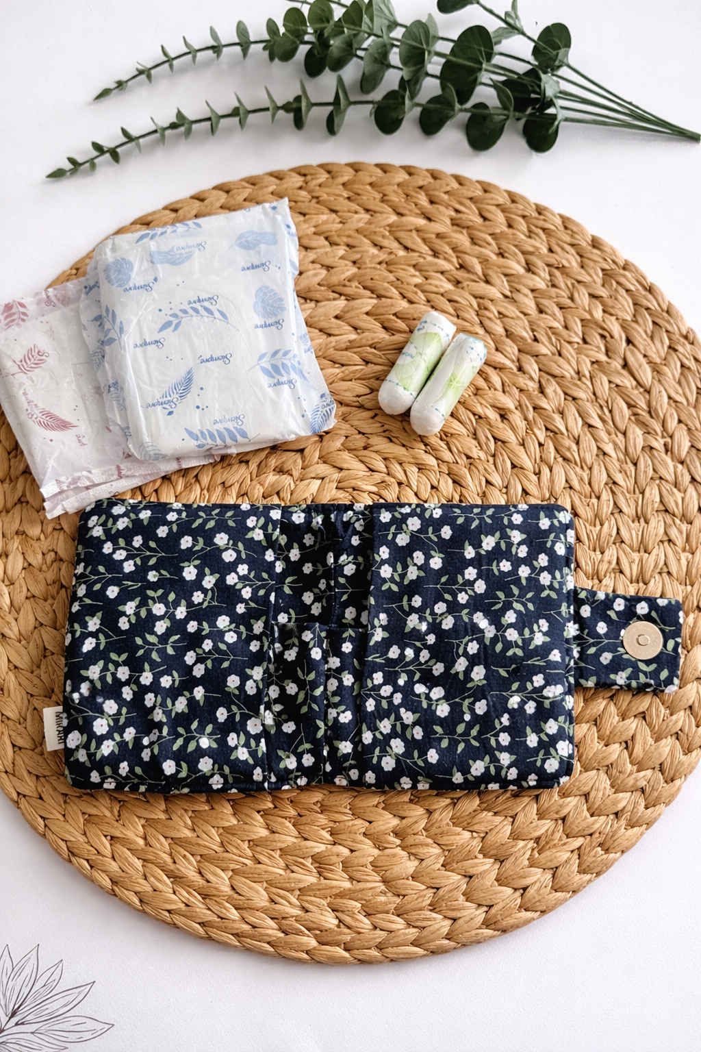 Porta assorbenti compatto e discreto, realizzato a mano, pensato per tenere tutto in ordine in borsa.